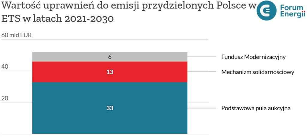 Jak wskazuje poniższy wykres udostępniony przez Forum Energii, Polska w latach 2021–2030 dysponuje znaczącą pulą środków wynikających z systemu EU ETS, której łączna wartość sięga kilkudziesięciu miliardów euro. Największa część pochodzi z podstawowej puli aukcyjnej, ale istotne wsparcie zapewniają również mechanizmy takie jak Fundusz Modernizacyjny oraz mechanizm solidarnościowy. Pokazuje to, że system EU ETS nie tylko generuje koszty emisji, ale jednocześnie stanowi ważne źródło finansowania transformacji energetycznej w Polsce.