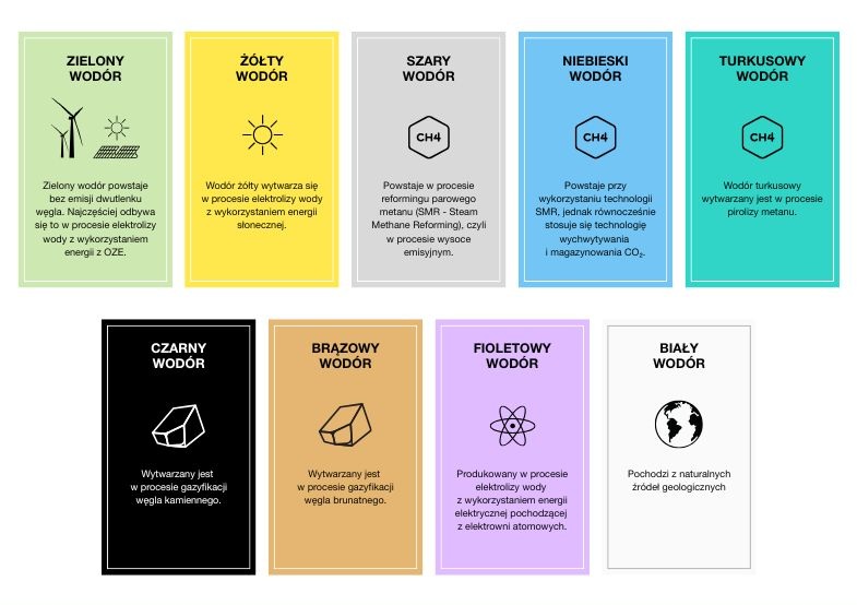 Sam wodór jako pierwiastek, jest gazem bezbarwnym. Dlatego kolory wodoru to kolory nie pierwiastka, a umowne kolory przypisywane technologii pozyskiwania wodoru.