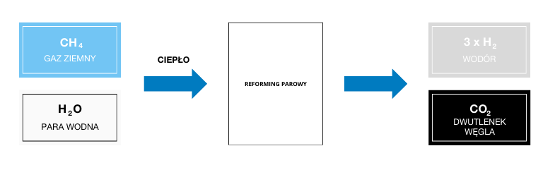 Pierwsza metoda dominuje w polskiej produkcji wodoru (stanowiąc 90% rocznej produkcji) – ale w kolejnych latach będziemy starać się od niej odejść na rzecz produkcji zielonego elektrolitycznego wodoru – wodoru nieemisyjnego i odnawialnego. Reforming parowy metanu, który jest głównym składnikiem gazu ziemnego, niesie za sobą około 9-10kg emisji CO2 na każdy wyprodukowany kilogram wodoru.